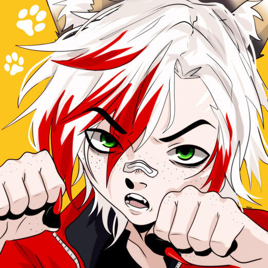 A small-built Miqo'te male who has pale skin. Jade eyes with naturally unkept hair which can be an array of colors, though naturally his hair is white with dusty dark brown tips. A black gem on his forehead in the shape of a teardrop. Light freckles along his cheeks and over his nose, a lot more freckles can be found throughout his body. Normally wearing some sort of collar around his neck, at times with a large cat bell on it.